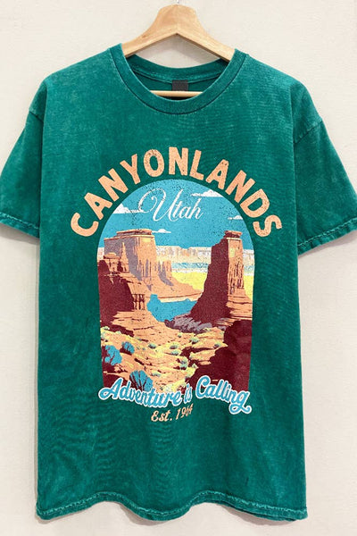 SHORT SLEEVE GARMENT-DYED/MINERAL-WASHED CANYONLANDS UTAH VINTAGE-INSPIRED OVERSIZED SUMMER NATURE OUTDOORS ADVENTURE GRAPHIC TEE *FEATURES CONVENIENT TEARABLE / TEAR AWAY LABEL.