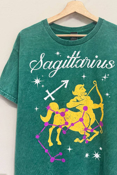 SHORT SLEEVE GARMENT-DYED/MINERAL-WASHED "SAGITTARIUS" ZODIAC SIGN OVERSIZED GRAPHIC TEE *FEATURES CONVENIENT TEARABLE / TEAR-AWAY LABEL.