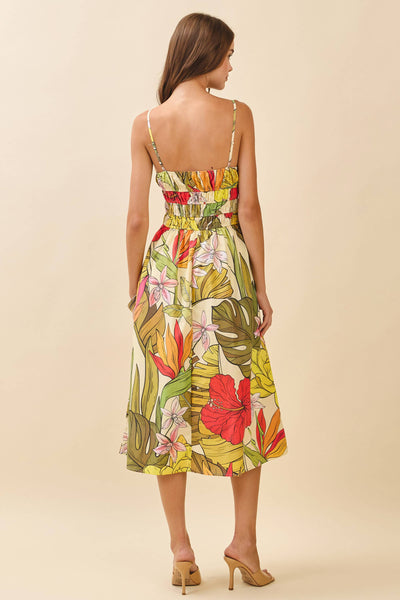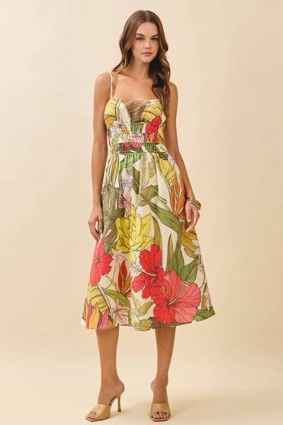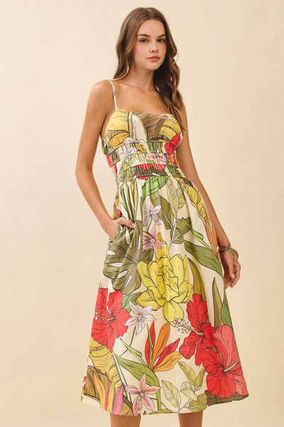 A bold floral print midi dress with adjustable spaghetti straps and a smocked bodice for a flattering fit. Features a flowy skirt and side pockets.