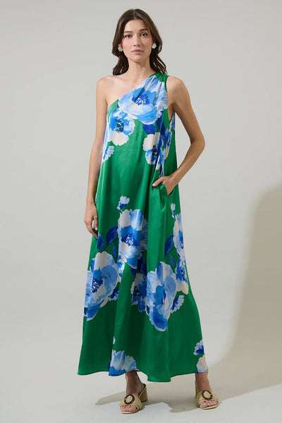 Perfect for casual outings and seasonal events, this dress offers a blend of comfort, elegance, and trend-forward style. A one shoulder pleated sleeve leads to a flowy fit maxi dress. It has an invisible zipper on the side as well as pockets on each side. Blue or green heels would match perfectly. - One shoulder - Floral - Pleated - Maxi - Color: Green Blues Size + Fit - Model is 5'9 and wearing size XS - Measurements taken from size S - Chest: 19" - Length: 55 3/4"