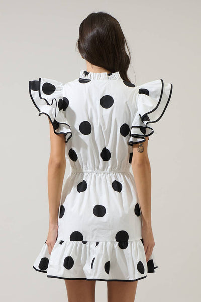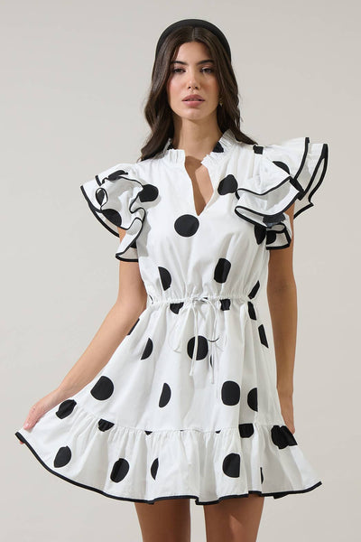When in doubt, go with dots! This playful piece brings dramatic ruffles around the short sleeves frame split neckline with a mock ruffle neck. The bodice has a shift design and a drawstring belt around the waist. Pair it with strappy heels to complete your chic look! - Split neck - Shift mini dress - Drawstring - Ruffles