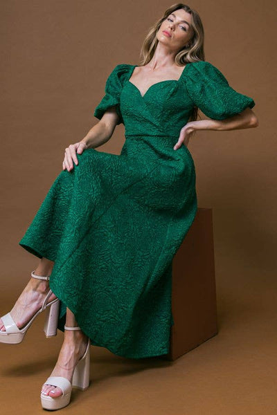 A textured woven midi dress featuring surplice sweetheart neckline, short puff sleeve, A line skirt and back zipper closure.