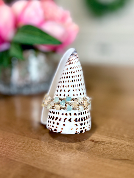 Our dainty gold stackable bracelet is romantic and sweet. This stretchy women's bracelet features an angelic palette of pale blue, mint green, and light earth tones. Non-tarnish, gold-filled beads separate the sweet heart beads.