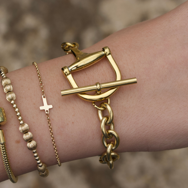 Add classic equestrian style and confidence with this Horse Bit Toggle Bracelet crafted in 18K gold-plated non-tarnish stainless steel. Designed to be water-resistant and durable, this bracelet delivers timeless style with a bold yet refined look that feels polished and put together.