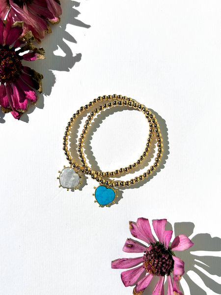 These darling heart stackable bracelets feature a single signature charm, exclusively handmade for Kaylie Dawn in either real turquoise or real rainbow moonstone. - Made in USA - Handmade in Rhode Island - 18k gold plated beads, 4mm - 7”, stretch - Tarnish-resistant Kaylie Dawn jewelry reaches women of all generations through its timeless aesthetic and durable design. Popular among shoppers who support independent and woman-owned brands, it is carried by retailers across the USA, Canada, and UK. The Kaylie Dawn Jewelry collection includes: - Many gemstones and colors - Comfortable, lightweight jewelry - Long-lasting, durable jewelry - Jewelry for sensitive skin There are stackable bracelets, stretchy bracelets, heart jewelry. Kaylie Dawn pairs well with other contemporary designer brands like enewton, Chan Luu, Jane Win, BuDhaGirl, Mignonne Gavigan, and many others.
