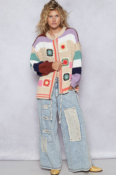 Designed in open cardigan, balloon sleeve, oversized fit in chenille sweater with handmade patch detail pointed striped pattern.