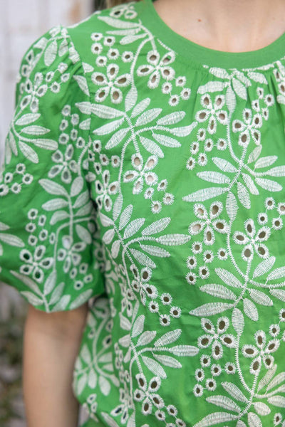• Round neckline with band • Short bubble sleeves • Bottom ruffle band • Leaf embroidered eyelet cotton fabric top • Size information: Model height 5' 8”, wearing size Small