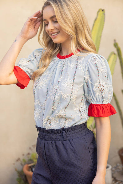 Embroidered short sleeve blouse with floral eyelet details and contrast ruffle trim, designed in a lightweight woven fabric with a relaxed fit for easy spring and summer styling.