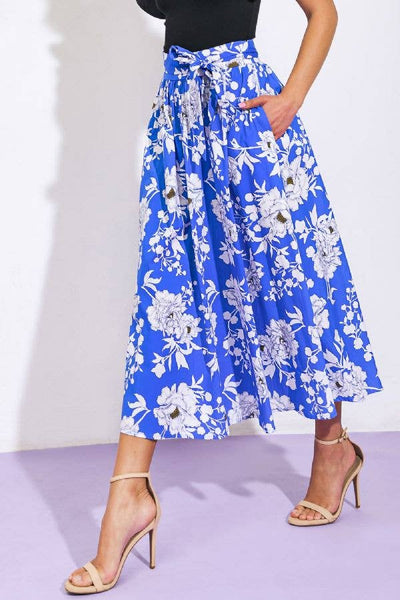 A printed poplin skirt featuring waist band, self sash tie, side zipper closure and full skirt with side pockets