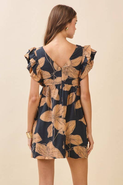 Floral print mini dress featuring ruffled cap sleeves, a plunging V-neckline with tie detail, and an empire waist. Finished with side pockets, back hidden zipper and a relaxed babydoll silhouette.