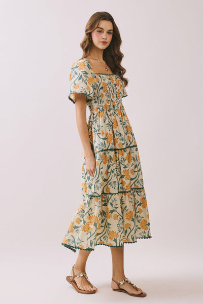 A floral-print midi dress featuring a smocked bodice and a square neckline. Designed with short flutter sleeves and a tiered A-line skirt for a breezy silhouette. Accented with contrast scallop trim along the sleeves and hem. Finished with hidden side pockets.