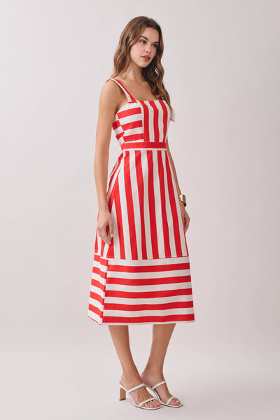A striped midi dress featuring wide straps and a square neckline. Designed with alternating vertical and horizontal stripe panels for a bold look. The fitted bodice is finished with a back zipper closure.