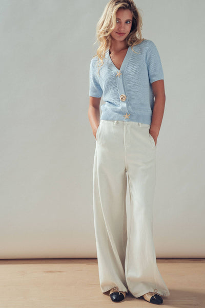 Design: Light blue V-neck cardigan accented with large gold-tone seashell and starfish shaped buttons.