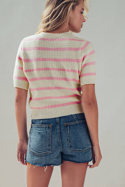 Crafted from a textured, breathable fabric, it features cheerful pink stripes on a cream base and is finished with elegant gold-tone buttons for a polished touch.