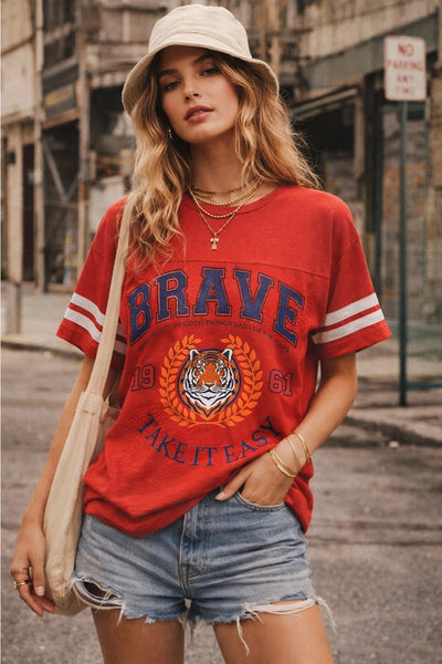 SHORT SLEEVE VARSITY/JERSEY-INSPIRED "BRAVE" TIGER OVERSIZED GRAPHIC TEE