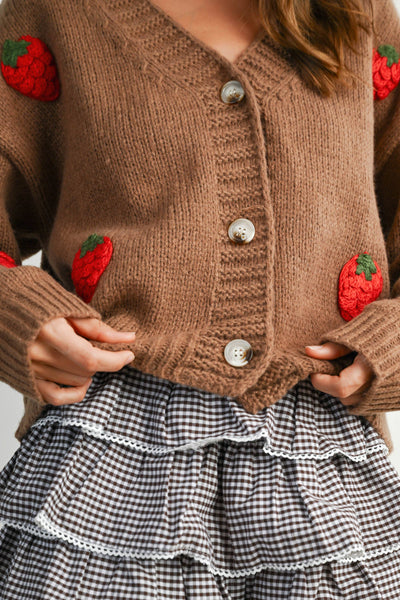 This soft, lightweight cardigan features an eye-catching strawberry embroidery that adds a playful touch to any outfit. The cropped length is perfect for layering over your favorite dresses or high-waisted jeans, creating a flattering silhouette.