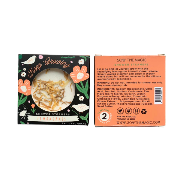 Let it all go and let yourself grow with this recharging lemongrass infused shower steamer. A shower steamer - just like a bath bomb - but for your shower. It is activated by water and releases aromatherapeutic essential oils designed to help calm, relax, destress or energize. For the ultimate aromatherapy experience: Place the steamer in the shower where it is damp; taking care to avoid the direct flow of water. We do not want it to dissolve too quickly.